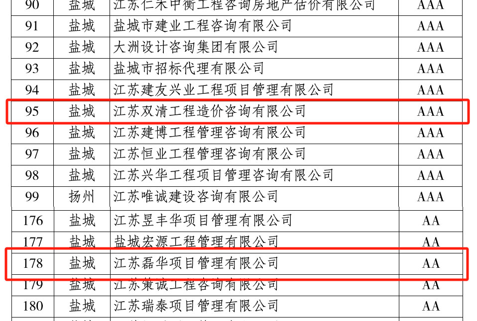 江蘇磊華項(xiàng)目管理有限公司獲得省AA級(jí)招標(biāo)代理信用評(píng)價(jià)、江蘇雙清工程造價(jià)咨詢(xún)有限公司獲得省AAA級(jí)招標(biāo)代理信用評(píng)價(jià)
